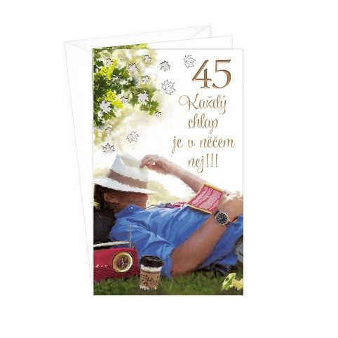 Přání k 45. narozeninám pro muže s textem uvnitř. Součástí blahopřání je barevně sladěna obálka. Originální technologie zpracování přáníčka od společnosti ARGUS - "Na detailu záleží!"