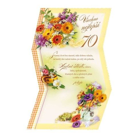 Přání k 70. narozeninám - listina s textom. Součástí balení je i barevně sladěná obálka. Originální technologie zpracování přáníčka od společnosti ARGUS - "Na detailu záleží!"