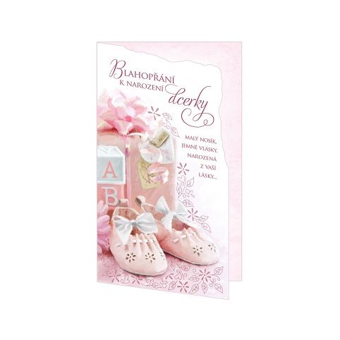 Blahopřání k narození dítěte s textem. Přidanou hodnotou přáníčka je kapsa na peníze, která se nachází uvnitř přání. Součástí blahopřání je barevně sladěna obálka. Originální technologie zpracování od společnosti ARGUS - "Na detaile záleží!"