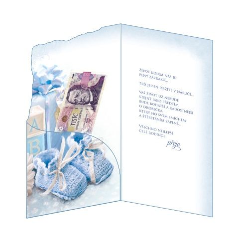 Blahopřání k narození dítěte s textem. Přidanou hodnotou přáníčka je kapsa na peníze, která se nachází uvnitř přání. Součástí blahopřání je barevně sladěna obálka. Originální technologie zpracování od společnosti ARGUS - "Na detaile záleží!"