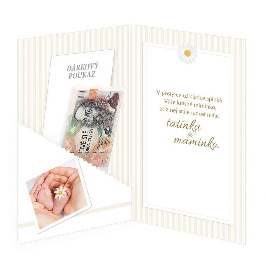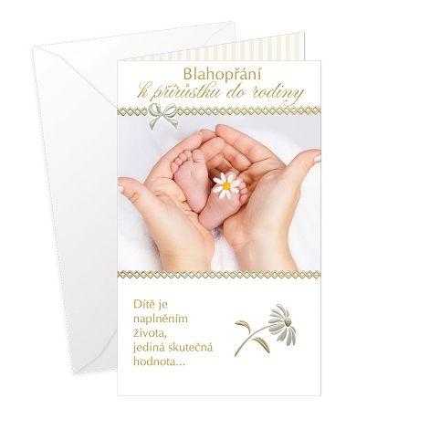 Blahopřání k narození dítěte s textem. Přidanou hodnotou přáníčka je kapsa na peníze uvnitř přání. Součástí přání je barevně sladěna obálka. Originální technologie zpracování od společnosti ARGUS - "Na detaile záleží!"
