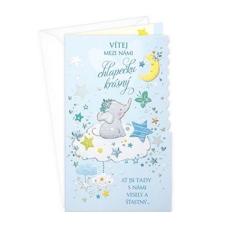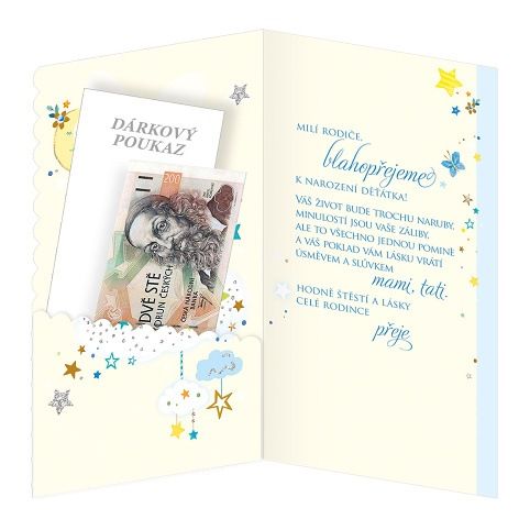 Přání k narození chlapečka s textem. Přidanou hodnotou přáníčka je kapsa na peníze uvnitř přání. Součástí přání je barevně sladěna obálka. Originální technologie zpracování od společnosti ARGUS - "Na detaile záleží!"