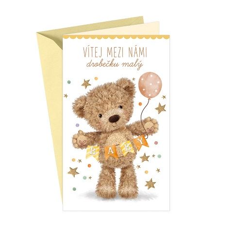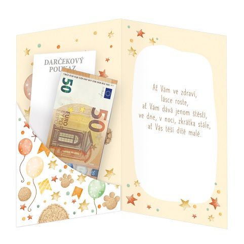 Blahopřání k narození dítěte s textem. Přidanou hodnotou přáníčka je kapsa na peníze, která se nachází uvnitř přání. Součástí blahopřání je barevně sladěna obálka. Originální technologie zpracování od společnosti ARGUS - "Na detaile záleží!"