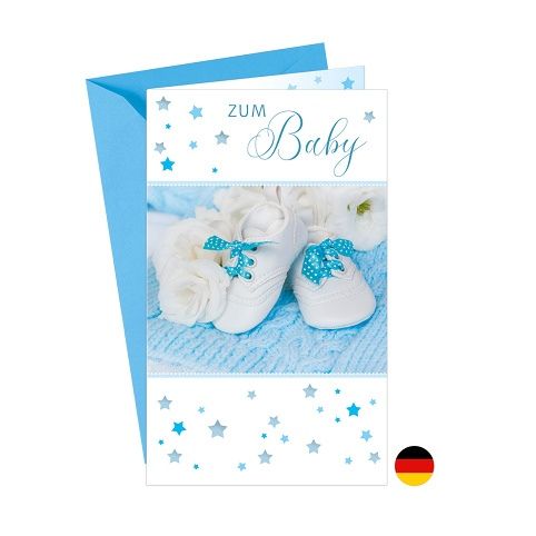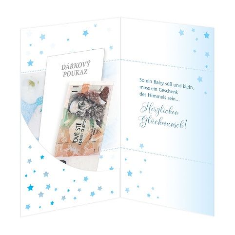 Blahopřání k narození dítěte s německým textem. Přidanou hodnotou přáníčka je kapsa na peníze uvnitř přání. Součástí přání je barevně sladěna obálka. Originální technologie zpracování od společnosti ARGUS - "Na detaile záleží!"
