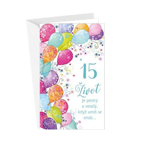 Přání k 15. narozeninám s textem uvnitř. Součástí blahopřání je barevně sladěna obálka. Originální technologie zpracování přáníčka od společnosti ARGUS - "Na detailu záleží!"