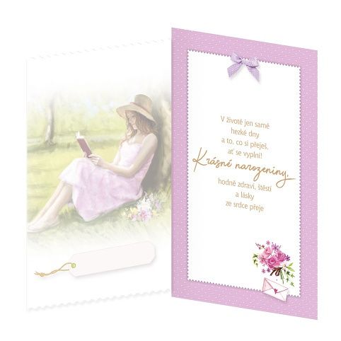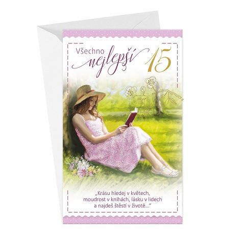 Přání pro dívku k 15. narozeninám s textem uvnitř. Součástí blahopřání je barevně sladěna obálka. Originální technologie zpracování přáníčka od společnosti ARGUS - "Na detailu záleží!"