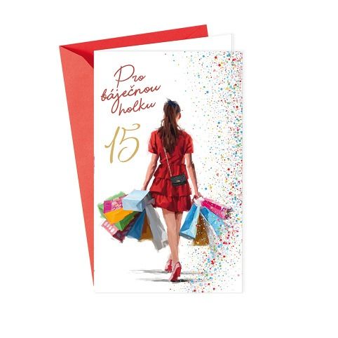 Přání k 15. narozeninám s textem a záložkou na peníze uvnitř přání. Součástí blahopřání je barevně sladěna obálka. Originální technologie zpracování přáníčka od společnosti ARGUS - "Na detailu záleží!"