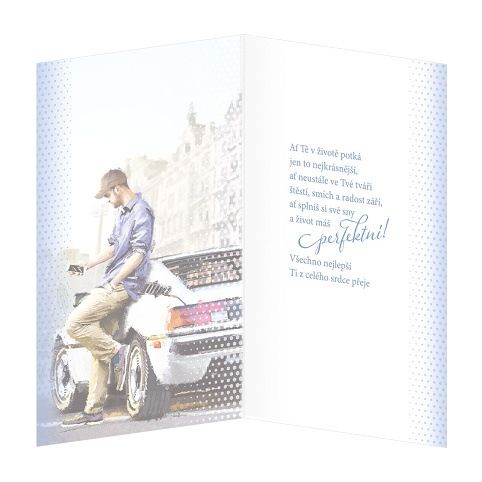 Přání k narozeninám pro muže s textem uvnitř přání. Součástí blahopřání je barevně sladěna obálka. Originální technologie zpracování přáníčka od společnosti ARGUS - "Na detailu záleží!"