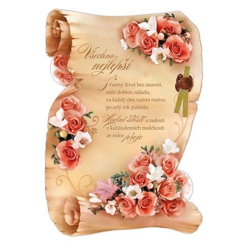 Přání k narozeninám pro ženu - listina. S textem uvnitř přání. Součástí balení je i barevně sladěná obálka. Originální technologie zpracování přáníčka od společnosti ARGUS - "Na detailu záleží!"