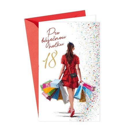 Přání k 18. narozeninám s textem a záložkou na peníze uvnitř přání. Součástí blahopřání je barevně sladěna obálka. Originální technologie zpracování přáníčka od společnosti ARGUS - "Na detailu záleží!"