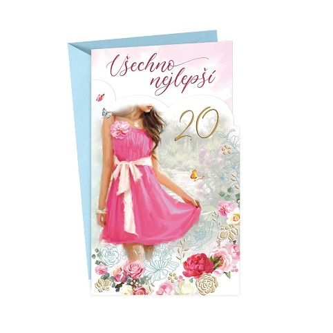 Přání pro dívku k 20. narozeninám s textem uvnitř. Součástí blahopřání je barevně sladěna obálka. Originální technologie zpracování přáníčka od společnosti ARGUS - "Na detailu záleží!"