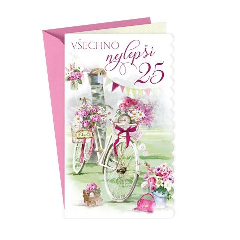 Přání k 25. narozeninám pro ženu s textem uvnitř. Součástí blahopřání je barevně sladěna obálka. Originální technologie zpracování přáníčka od společnosti ARGUS - "Na detailu záleží!"
