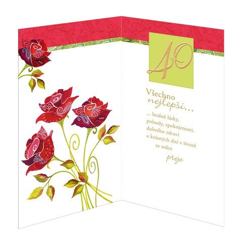 Přání k 40. narozeninám s textem uvnitř přání. Součástí blahopřání je barevně sladěna obálka. Originální technologie zpracování přáníčka od společnosti ARGUS - "Na detailu záleží!"