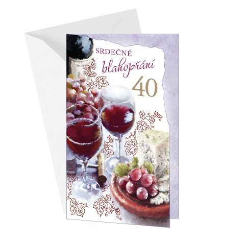 Přání k 40. narozeninám pro milovníka vína s textem uvnitř přání. Součástí blahopřání je barevně sladěna obálka. Originální technologie zpracování přáníčka od společnosti ARGUS - "Na detailu záleží!"