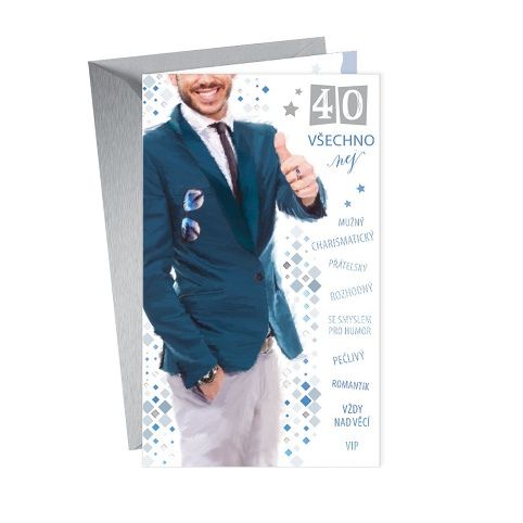 Přání k 40. narozeninám pro muže s textem uvnitř. Součástí blahopřání je barevně sladěna obálka. Originální technologie zpracování přáníčka od společnosti ARGUS - "Na detailu záleží!"