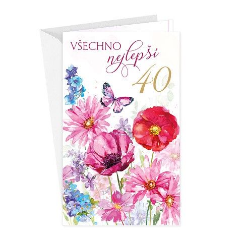 Přání k 40. narozeninám s textem a záložkou na peníze uvnitř přání. Součástí blahopřání je barevně sladěna obálka. Originální technologie zpracování přáníčka od společnosti ARGUS - "Na detailu záleží!"