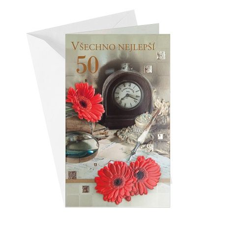 Přání k 50. narozeninám s textem uvnitř přání. Součástí blahopřání je barevně sladěna obálka. Originální technologie zpracování přáníčka od společnosti ARGUS - "Na detailu záleží!"