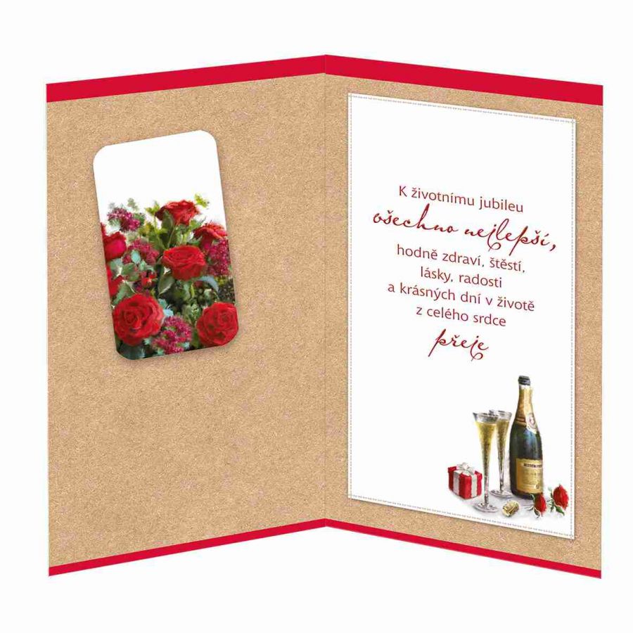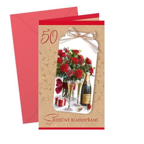 Přání k 50. narozeninám s textem uvnitř a s malým dárkem - záložkou do knihy. Součástí blahopřání je barevně sladěna obálka. Originální technologie zpracování přáníčka od společnosti ARGUS - "Na detailu záleží!"