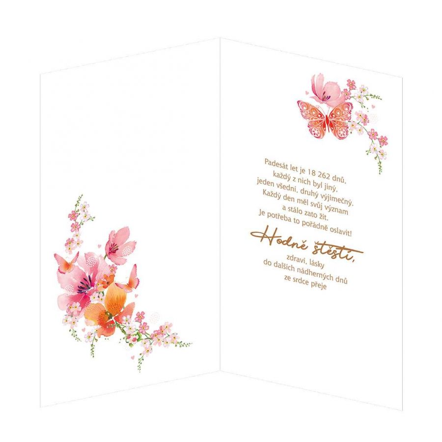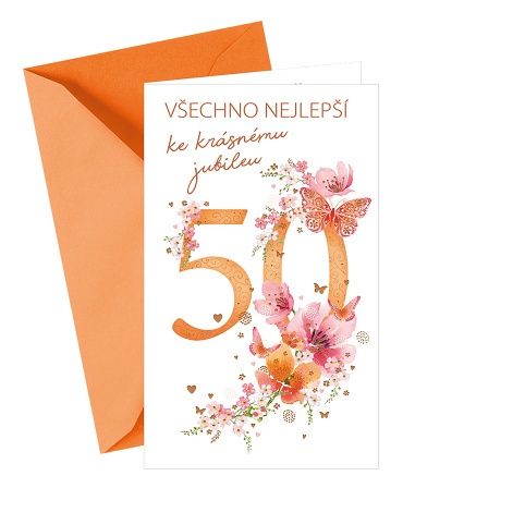 Přání k 50. narozeninám s textem uvnitř. Součástí blahopřání je barevně sladěna obálka. Originální technologie zpracování přáníčka od společnosti ARGUS - "Na detailu záleží!"