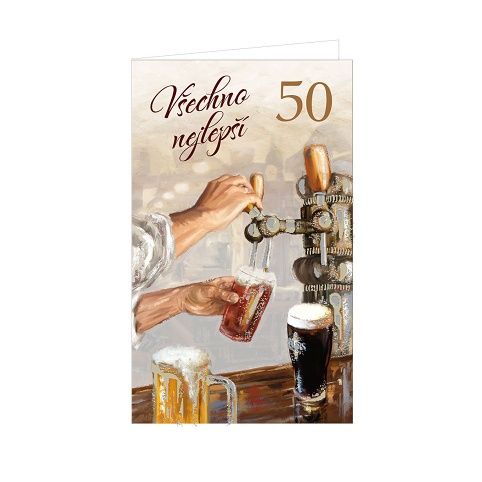 Přání k 50. narozeninám pro milovníka piva a s textem uvnitř. Součástí blahopřání je barevně sladěna obálka. Originální technologie zpracování přáníčka od společnosti ARGUS - "Na detailu záleží!"