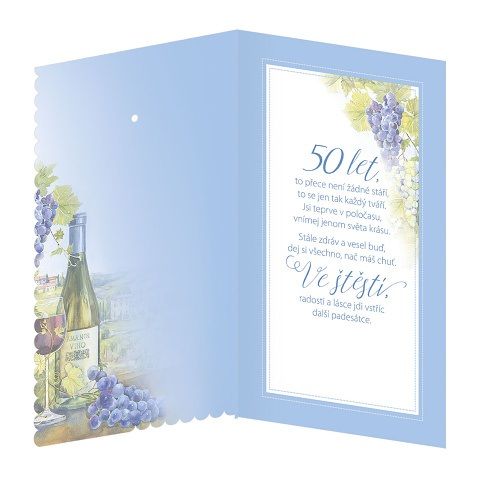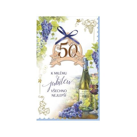 Přání k 50. narozeninám s textem uvnitř přání a dřevěnou ozdobou na vrchní části. Součástí blahopřání je barevně sladěna obálka. Originální technologie zpracování přáníčka od společnosti ARGUS - "Na detailu záleží!"