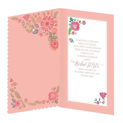 Přání k 50. narozeninám s textem uvnitř přání a dřevěnou ozdobou na vrchní části. Součástí blahopřání je barevně sladěna obálka. Originální technologie zpracování přáníčka od společnosti ARGUS - "Na detailu záleží!"