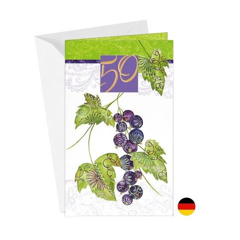 Přání k 50. narozeninám. Německé přání s textem uvnitř. Součástí blahopřání je barevně sladěna obálka. Originální technologie zpracování přáníčka od společnosti ARGUS - "Na detailu záleží!"