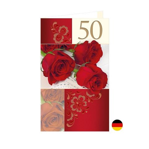 Přání k 50. narozeninám. Německé přání bez textu uvnitř. Součástí blahopřání je barevně sladěna obálka. Originální technologie zpracování přáníčka od společnosti ARGUS - "Na detailu záleží!"
