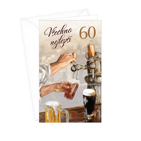 Přání k 60. narozeninám pro milovníka piva a s textem uvnitř. Součástí blahopřání je barevně sladěna obálka. Originální technologie zpracování přáníčka od společnosti ARGUS - "Na detailu záleží!"