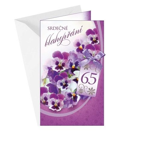 Přání k 65. narozeninám s lepeným komponentem - mašlička. Součástí blahopřání je barevně sladěna obálka a inspirační texty, ze kterých můžete použít to, které se vám nejvíce líbí. Originální technologie zpracování přáníčka od společnosti ARGUS - "Na detailu záleží!"