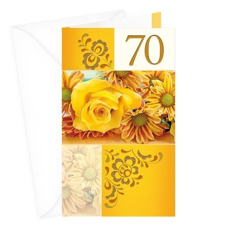 Přání k 70. narozeninám s textem a záložkou na peníze uvnitř přání. Součástí blahopřání je barevně sladěna obálka. Originální technologie zpracování přáníčka od společnosti ARGUS - "Na detailu záleží!"