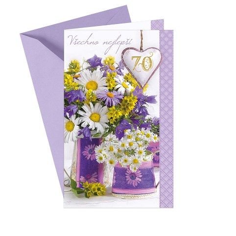 Přání k 70. narozeninám s textem uvnitř. Součástí blahopřání je barevně sladěna obálka. Originální technologie zpracování přáníčka od společnosti ARGUS - "Na detailu záleží!"