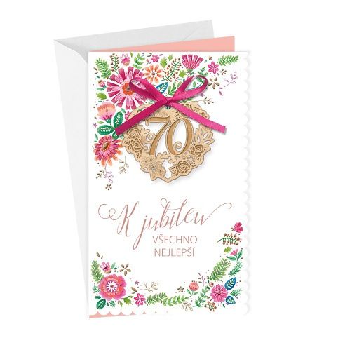 Přání k 70. narozeninám s textem uvnitř přání a dřevěnou ozdobou na vrchní části. Přání je zdobeno mašličkou. Součástí blahopřání je barevně sladěna obálka. Originální technologie zpracování přáníčka od společnosti ARGUS - "Na detailu záleží!"