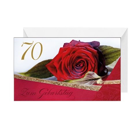 Přání k 70. narozeninám. Německý text na přední straně a bez textu uvnitř. Součástí blahopřání je barevně sladěna obálka. Originální technologie zpracování přáníčka od společnosti ARGUS - "Na detailu záleží!"
