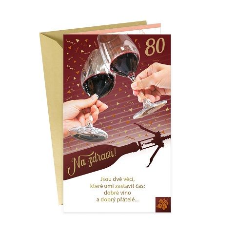 Přání k 80. narozeninám pro milovníka vína s textem uvnitř. Součástí blahopřání je barevně sladěna obálka. Originální technologie zpracování přáníčka od společnosti ARGUS - "Na detailu záleží!"