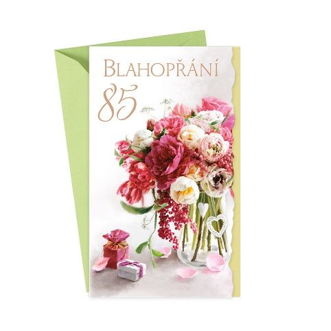 Přání k 85. narozeninám s textem uvnitř. Součástí blahopřání je barevně sladěna obálka. Originální technologie zpracování přáníčka od společnosti ARGUS - "Na detailu záleží!"