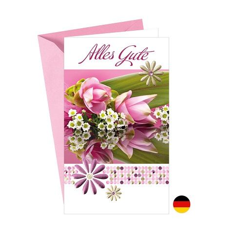 Přání k narozeninám. Německé přání bez textu uvnitř. Součástí blahopřání je barevně sladěna obálka. Originální technologie zpracování přáníčka od společnosti ARGUS - "Na detailu záleží!"