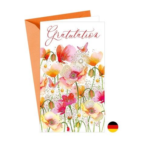 Narozeninové přání s německým textem na přední straně a bez textu uvnitř. Součástí blahopřání je barevně sladěna obálka. Originální technologie zpracování přáníčka od společnosti ARGUS - "Na detailu záleží!"