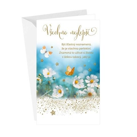 Přání k narozeninám nebo k svátku s textem uvnitř přání. Součástí blahopřání je barevně sladěna obálka. Originální technologie zpracování přáníčka od společnosti ARGUS - "Na detailu záleží!"