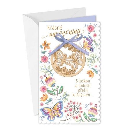 Přání k narozeninám s malým dřevěným dárkem - ozdobou. S textem uvnitř přání. Součástí balení je i barevně sladěná obálka. Originální technologie zpracování přáníčka od společnosti ARGUS - "Na detailu záleží!"