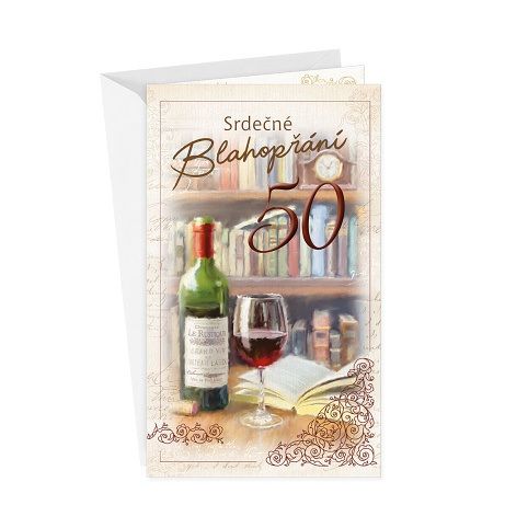 Přání k 50. narozeninám s textem a záložkou na peníze uvnitř přání. Součástí blahopřání je barevně sladěna obálka. Originální technologie zpracování přáníčka od společnosti ARGUS - "Na detailu záleží!"