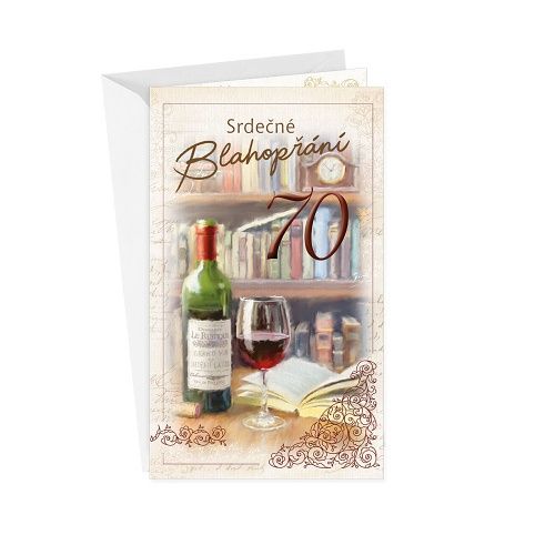 Přání k 70. narozeninám s textem a záložkou na peníze uvnitř přání. Součástí blahopřání je barevně sladěna obálka. Originální technologie zpracování přáníčka od společnosti ARGUS - "Na detailu záleží!"
