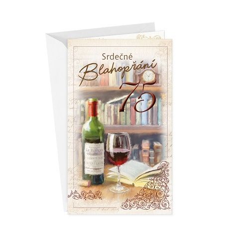 Přání k 75. narozeninám s textem a záložkou na peníze uvnitř přání. Součástí blahopřání je barevně sladěna obálka. Originální technologie zpracování přáníčka od společnosti ARGUS - "Na detailu záleží!"