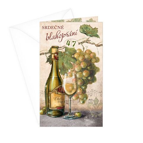 Přání k narozeninám pro milovníka vína s otočníkem a textem uvnitř přání. Otočník umožňuje výběr věku obdarovaného (od 10 po 99). Součástí blahopřání je barevně sladěna obálka. Originální technologie zpracování přáníčka od společnosti ARGUS - "Na detailu záleží!"