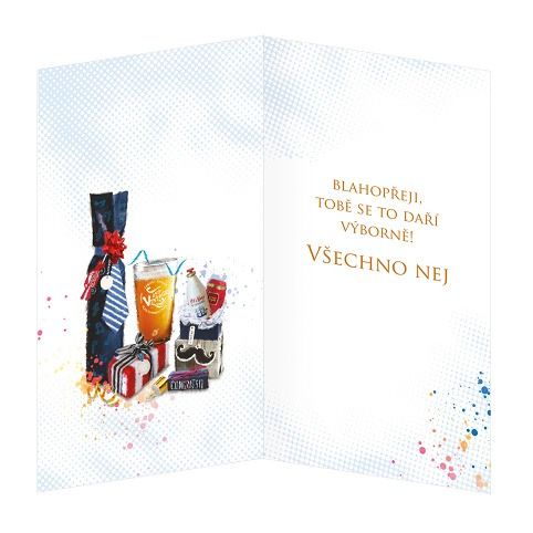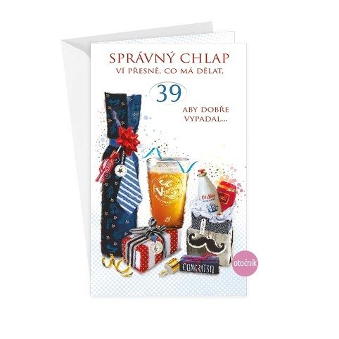 Přání k narozeninám pro muže s otočníkem a textem uvnitř přání. Otočník umožňuje výběr věku obdarovaného (od 10 po 99). Součástí blahopřání je barevně sladěna obálka. Originální technologie zpracování přáníčka od společnosti ARGUS - "Na detailu záleží!"