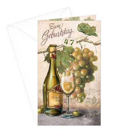 Přání k narozeninám s otočníkem. Otočník umožňuje výběr věku obdarovaného (od 10 po 99). Německý text na přední straně a bez textu uvnitř. Součástí blahopřání je barevně sladěna obálka. Originální technologie zpracování přáníčka od společnosti ARGUS - "Na detailu záleží!"
