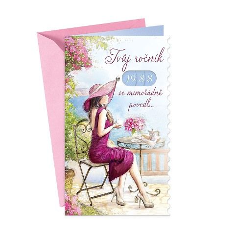 Narozeninové přání pro ženu s otočníkem s výběrem roku narození a textem uvnitř přání. Součástí blahopřání je barevně sladěna obálka. Originální technologie zpracování přáníčka od společnosti ARGUS - "Na detailu záleží!"