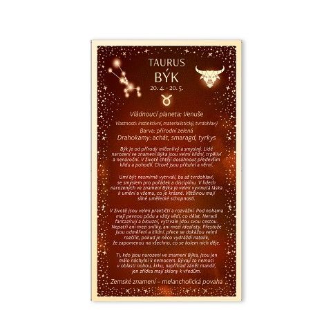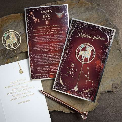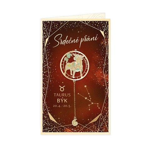 Blahopřání k narozeninám v luxusním provedení s metalickým efektem a kovovým přívěskem znamení zvěrokruhu - býk. Kovový přívěsek může být použit například i ako záložka do knihy. Text uvnitř přání: "Hodně štestí, protože s ním je život jednodušší, hodně zdraví, protože je v živote nejduležitější, dobrou náladu, protože s ní je život veselejší ze srdce přeje". Součástí balení je také kartička s charakteristikou znamení a obálka. Originální technologie zpracování na blahopřání od společnosti ARGUS - "Na detailu záleží!"