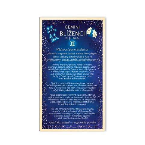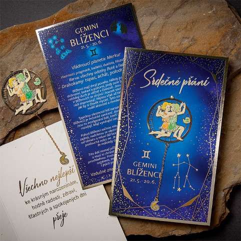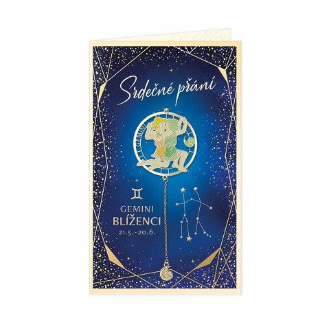 Blahopřání k narozeninám v luxusním provedení s metalickým efektem a kovovým přívěskem znamení zvěrokruhu - blíženci. Kovový přívěsek může být použit například i ako záložka do knihy. Text uvnitř přání: "Všechno nejlepší ke krásnym narozeninám, hodně radosti, zdraví, šťastných a pokojených dní přeje". Součástí balení je také kartička s charakteristikou znamení a obálka. Originální technologie zpracování na blahopřání od společnosti ARGUS - "Na detailu záleží!"