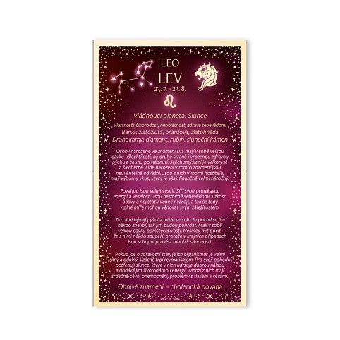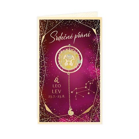 Blahopřání k narozeninám v luxusním provedení s metalickým efektem a kovovým přívěskem znamení zvěrokruhu - lev. Kovový přívěsek může být použit například i ako záložka do knihy. Text uvnitř přání: "Všechno nejlepší, krásný a pohodový život přeje". Součástí balení je také kartička s charakteristikou znamení a obálka. Originální technologie zpracování na blahopřání od společnosti ARGUS - "Na detailu záleží!"